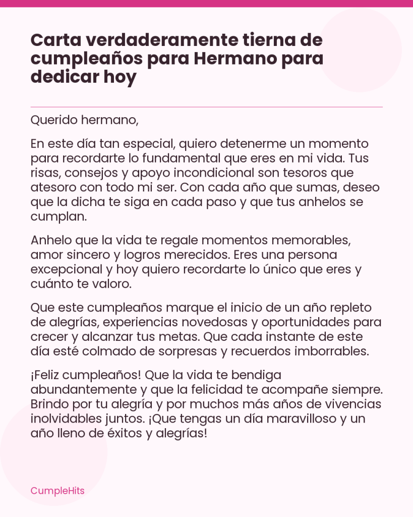 En este día tan especial, quiero detenerme un momento para recordarte lo fundamental que eres en mi vida. Tus risas, consejos y apoyo incondicional son tesoros que atesoro con todo mi ser. Con cada año que sumas, deseo que la dicha te siga en cada paso y que tus anhelos se cumplan.