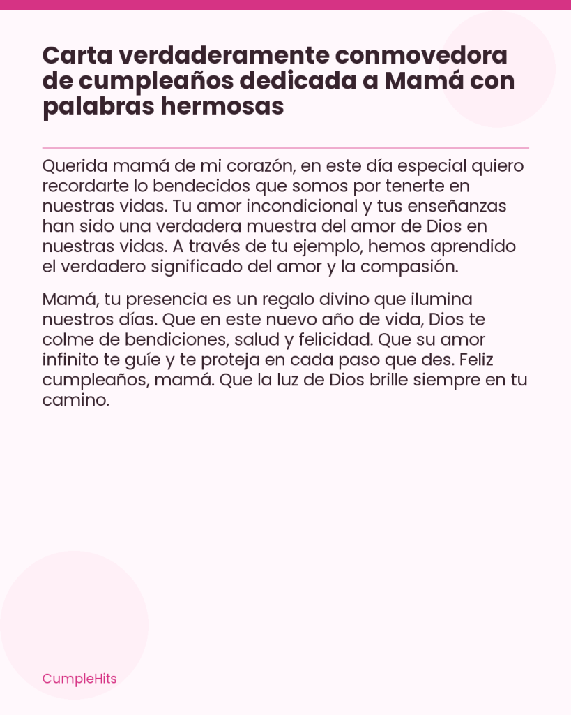 Mamá, tu presencia es un regalo divino que ilumina nuestros días. Que en este nuevo año de vida, Dios te colme de bendiciones, salud y felicidad. Que su amor infinito te guíe y te proteja en cada paso que des. Feliz cumpleaños, mamá. Que la luz de Dios brille siempre en tu camino.