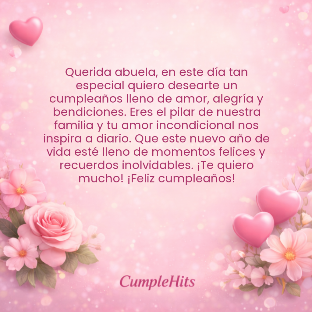 Querida abuela, en este día tan especial quiero desearte un cumpleaños lleno de amor, alegría y bendiciones. Eres el pilar de nuestra familia y tu amor incondicional nos inspira a diario. Que este nuevo año de vida esté lleno de momentos felices y recuerdos inolvidables. ¡Te quiero mucho! ¡Feliz cumpleaños! 🎂🎉🎈