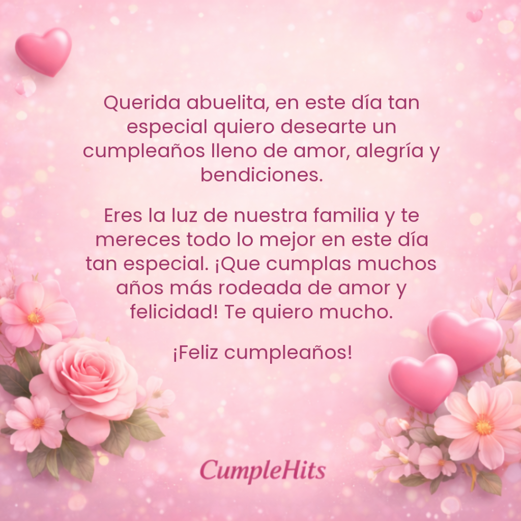 Querida abuelita, en este día tan especial quiero desearte un cumpleaños lleno de amor, alegría y bendiciones.