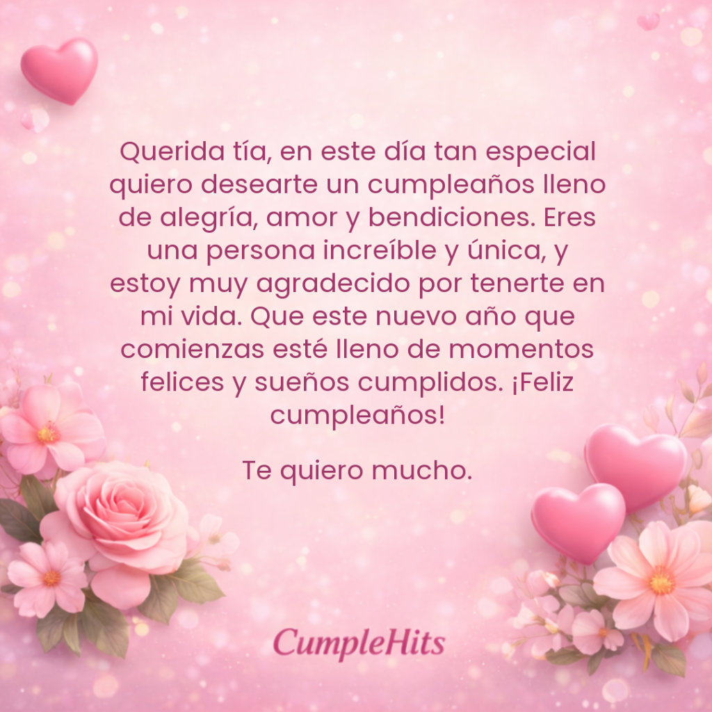 Querida tía, en este día tan especial quiero desearte un cumpleaños lleno de alegría, amor y bendiciones. Eres una persona increíble y única, y estoy muy agradecido por tenerte en mi vida. Que este nuevo año que comienzas esté lleno de momentos felices y sueños cumplidos. ¡Feliz cumpleaños!